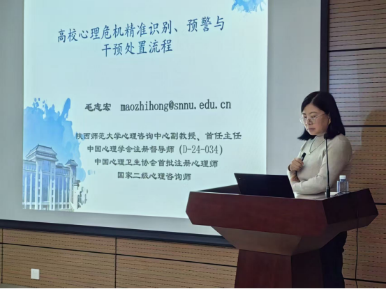 启动仪式后,毛志宏以《高校心理危机精准识别、预警与干预处置流程》为主题开展授课。课程围绕危机干预理论概述、核心知识要点、自杀预防策略等五大模块展开,她结合典型案例系统解读了心理危机核心理论和预警网络构建路径,重点强调了高关怀群体的精准识别及自杀风险征兆的捕捉技巧,并分享了干预实操流程与应急处置步骤规范,为辅导员提供了兼具理论高度与实践价值的危机干预解决方案。培训现场气氛热烈,辅导员们纷纷表示受益匪浅。
