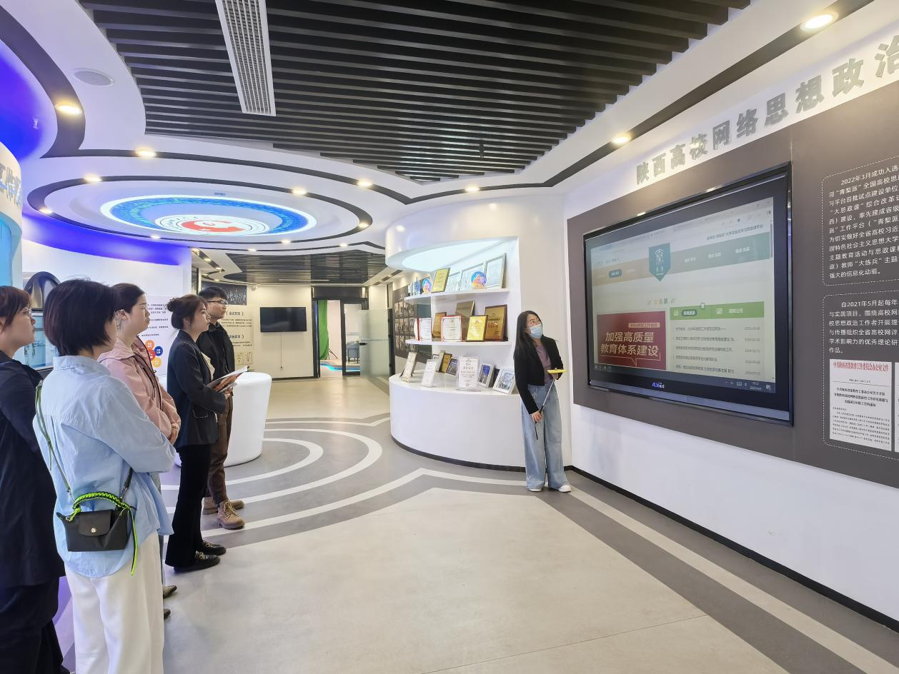 陕西高校网络思想政治工作中心副主任董雪对工作室一行表示热烈欢迎。陕西科技大学易班发展中心房若愚、网络思想政治工作中心范紫轩详细介绍了中心在数据分析、资源整合、平台运营等方面的整体架构与特色亮点。随后,工作室成员依次参观了中心大厅、精准赋能研究中心、网络思政研究中心以及优质网络文化作品培育众创空间,深入了解信息化平台建设与思想政治内容融合发展的具体实践,切实感受到技术赋能下网络思政的新形态与新可能。